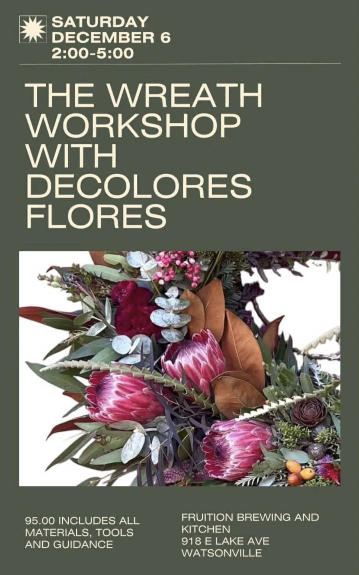 Join us with the fabulous Decolores Flores who will supply all the materials and instruction to make your own amazing holiday wreath! Contact https://www.decoloresflores.com/ to register.